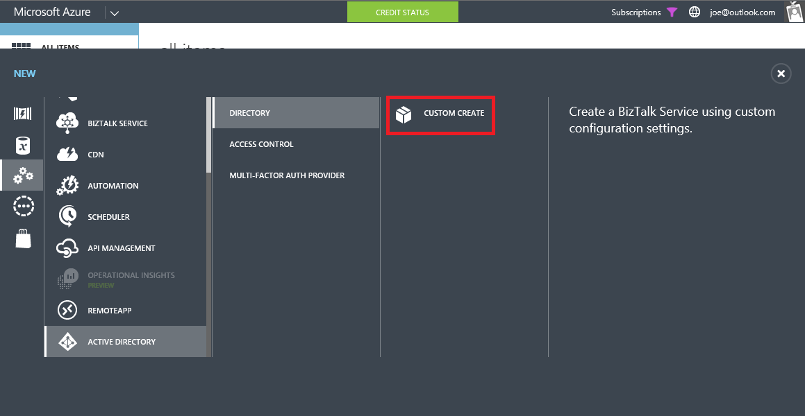 - Click New > App Services > Active Directory > Directory > Custom Create.