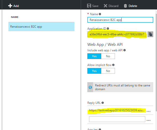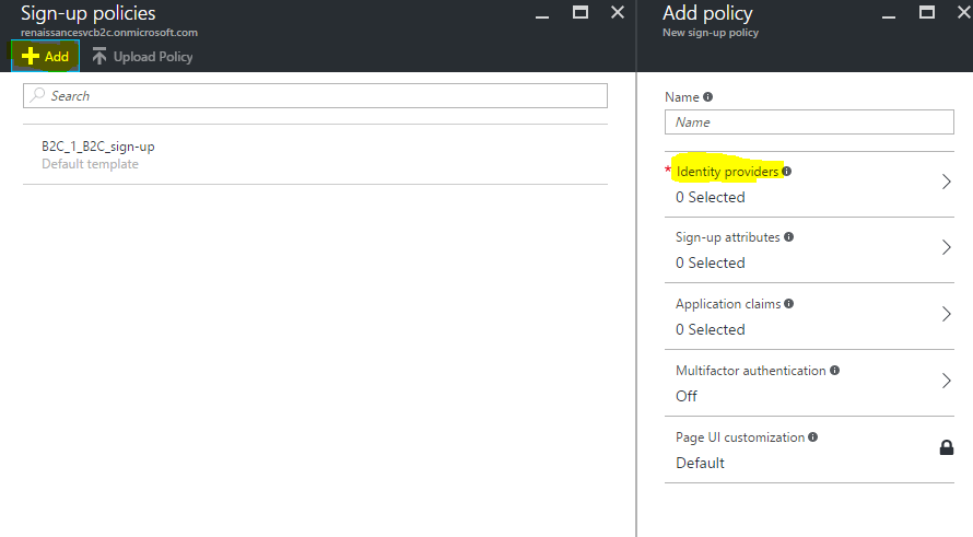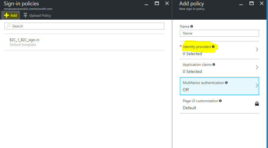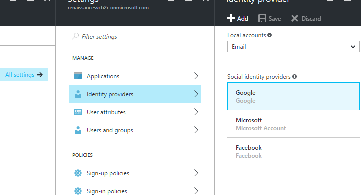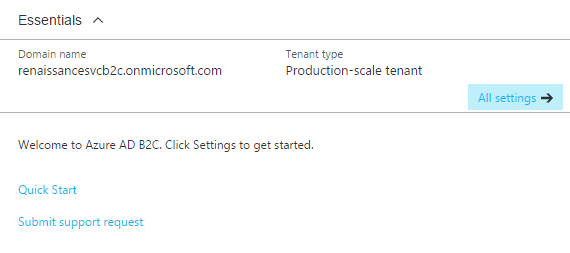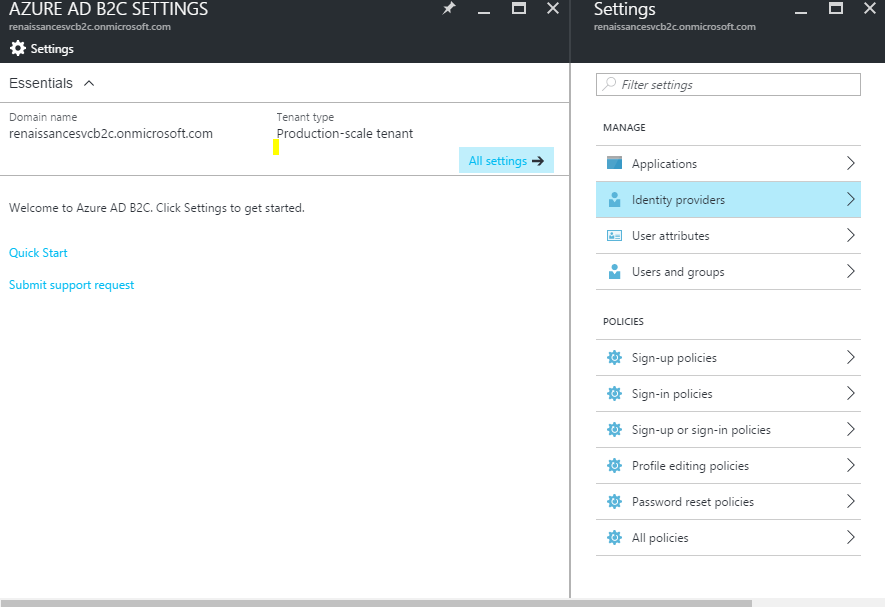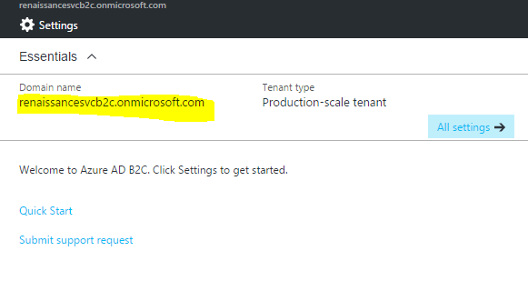 This is ‘renaissancesvcb2c.onmicrosoft.com’ your tenant ID and ‘https://www.contoso.com’URL will be required for configuring with Identity providers to sign up and sign in.