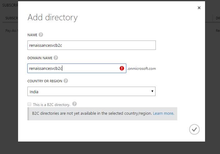 - B2C directories are not yet available in the selected country/region so select region or country B2C is available.