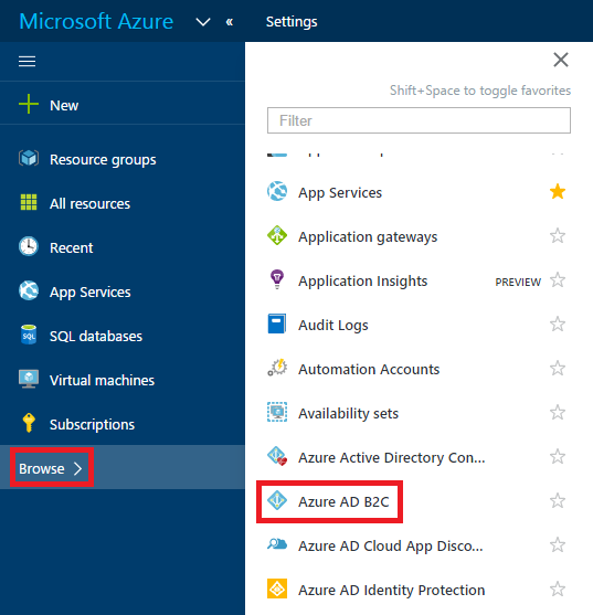- The Azure portal with the B2C features blade showing will open in a new browser tab or window.