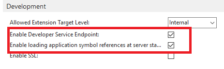 3. Under the Development tab at the bottom, Enable Developer Service Endpoint and Enable loading application symbol references at server startup.