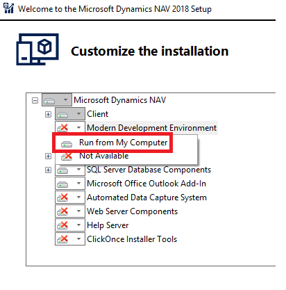 1. Run the Microsoft Dynamics NAV 2018 setup, click on Add or remove components then click on  the Modern Development Environment and select Run from My Computer.