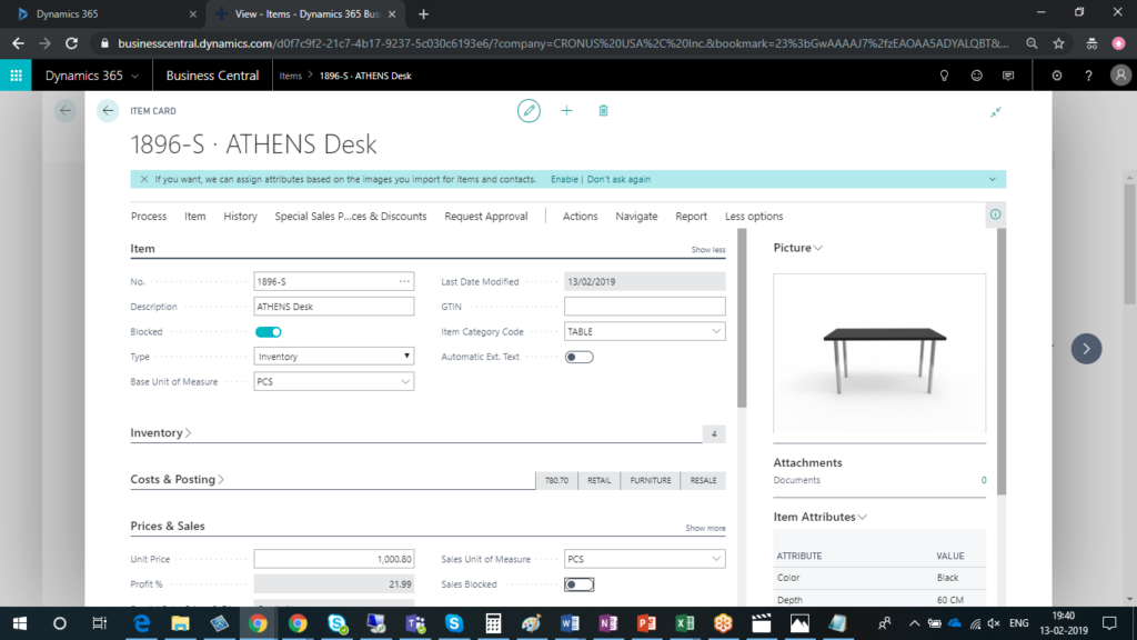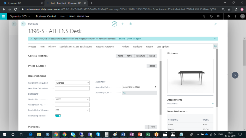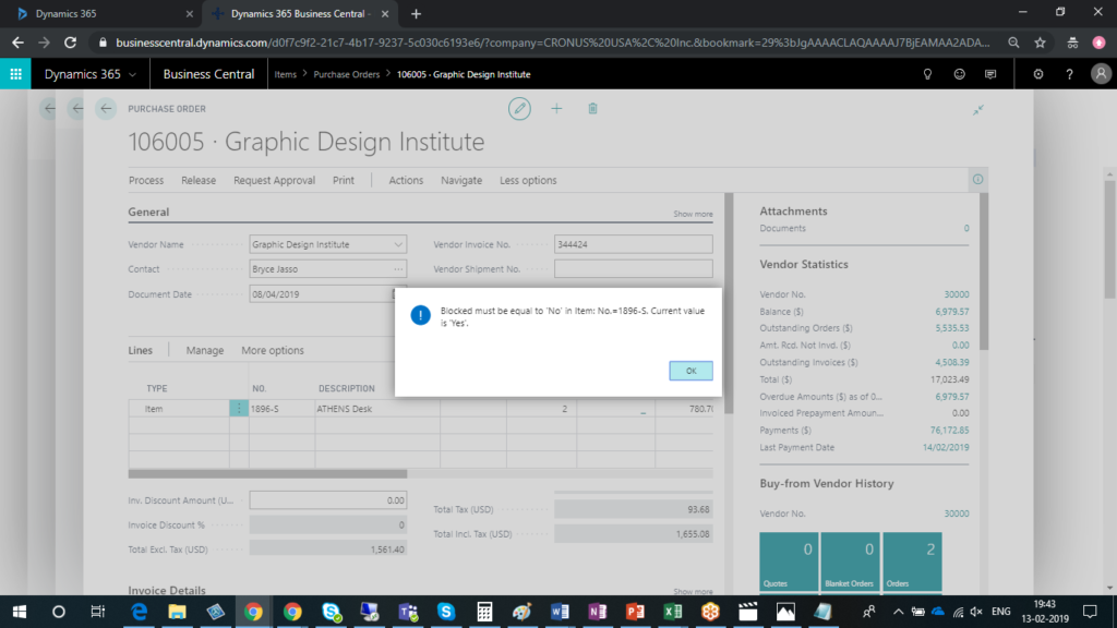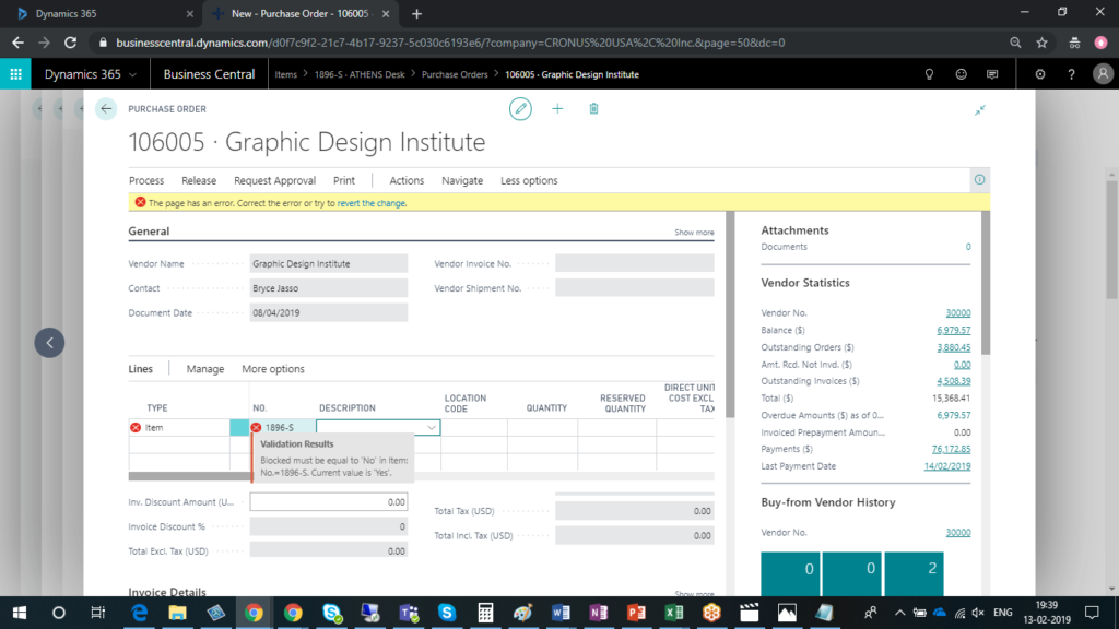 - If you try to enter the item on a purchase document or journal line, you will now get an error message that the item is blocked.