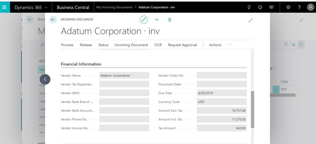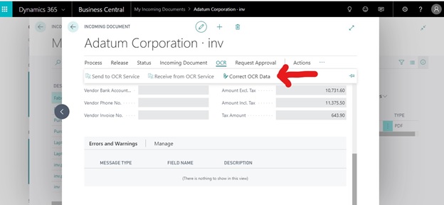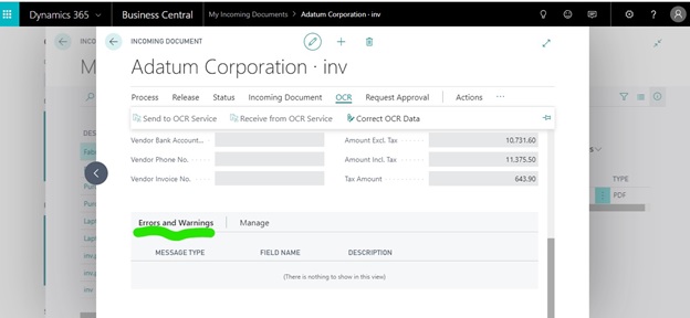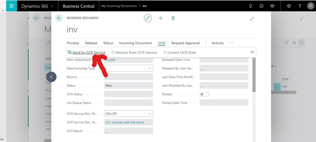 OCR service Setup and process in Microsoft Dynamics 365 Business Central