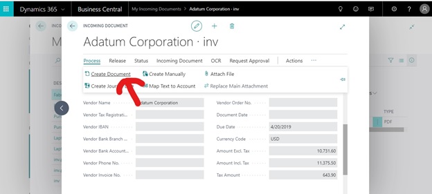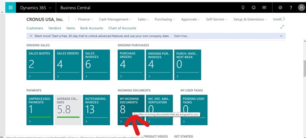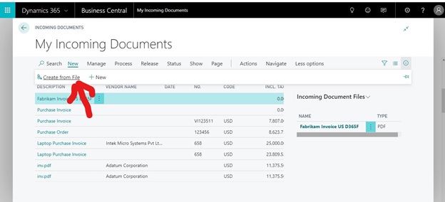 - Go to incoming documents in Microsoft Dynamics 365 Business Central.