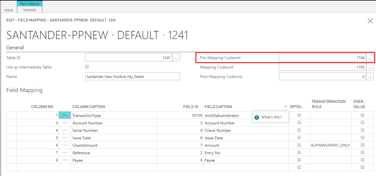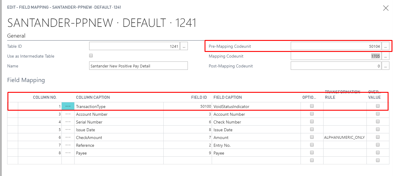 1. There is an existing codeunit(1704) which is used as Pre-Mapping Codeunit in field Mapping in Positive Pay Data Exchange Definition.