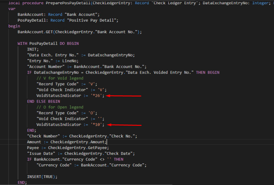 Positive Pay Export having multi-length Void Check Indicator in Business Central for Santader Bank.