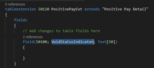 2. Create a Table Extension for Table 1241( Positive Pay Detail)and added a text field name ‘VoidStatusIndicator’ of size 50
