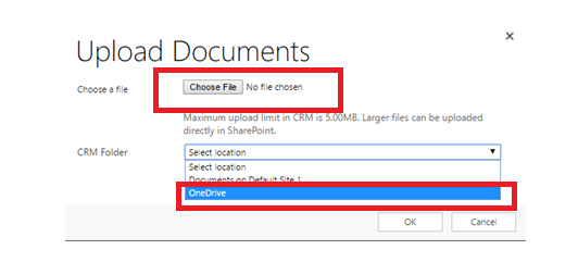 Step 6: Choose the file to Upload and in CRM folder, select OneDrive.