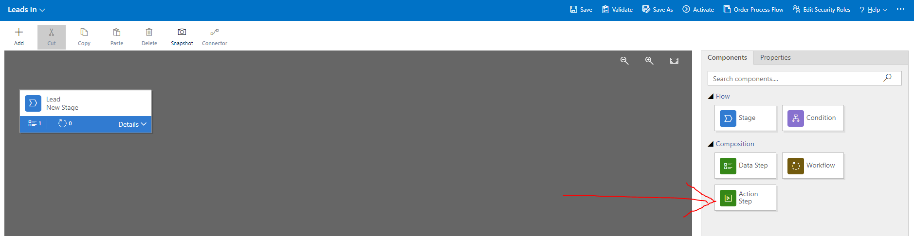 Once you’ve enabled the Preview feature, you should be able to see Action Step visible in the Business Process Flow editor as shown below: