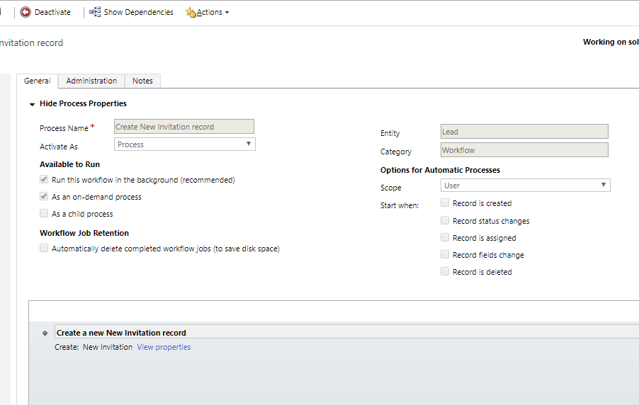 I have a Workflow to create a New Invitation entity record in D365. I’ll be adding the same in the BPF.
