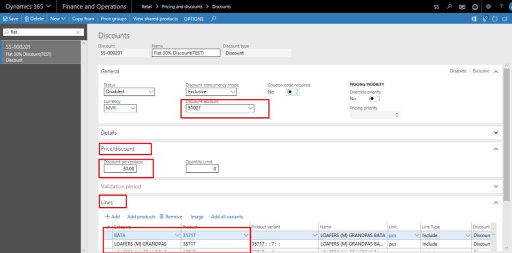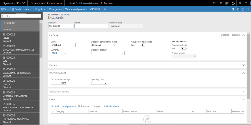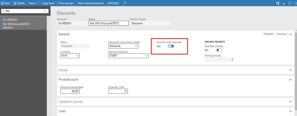 Step 6:  Create a New Discount. Mention the discount Price, Products in Lines, Price group, Valid Discount Account and enable coupon code required.