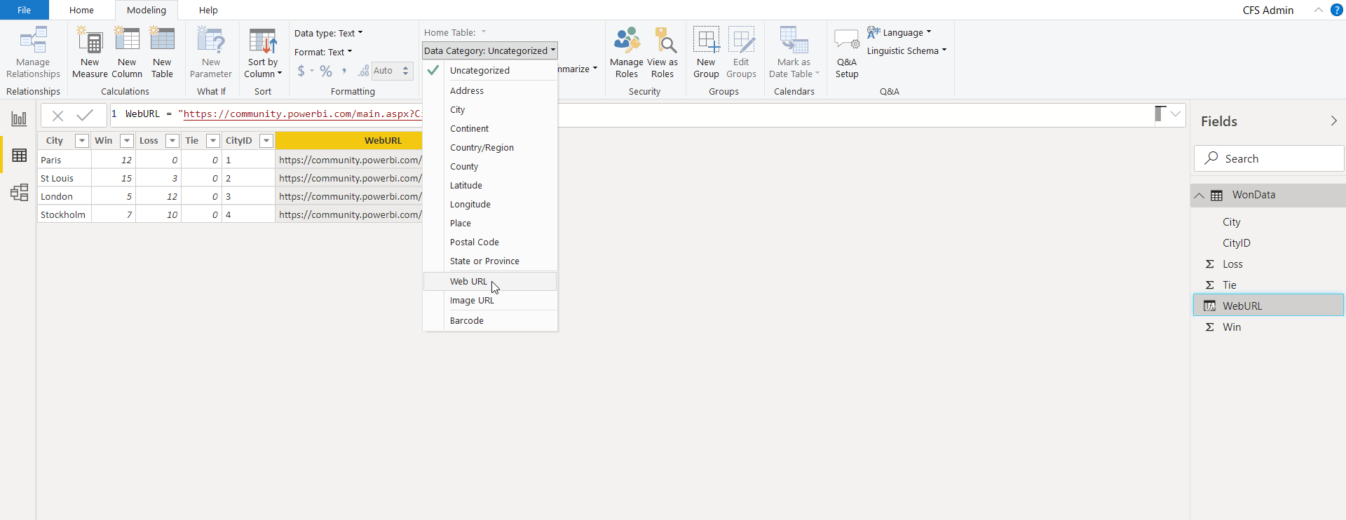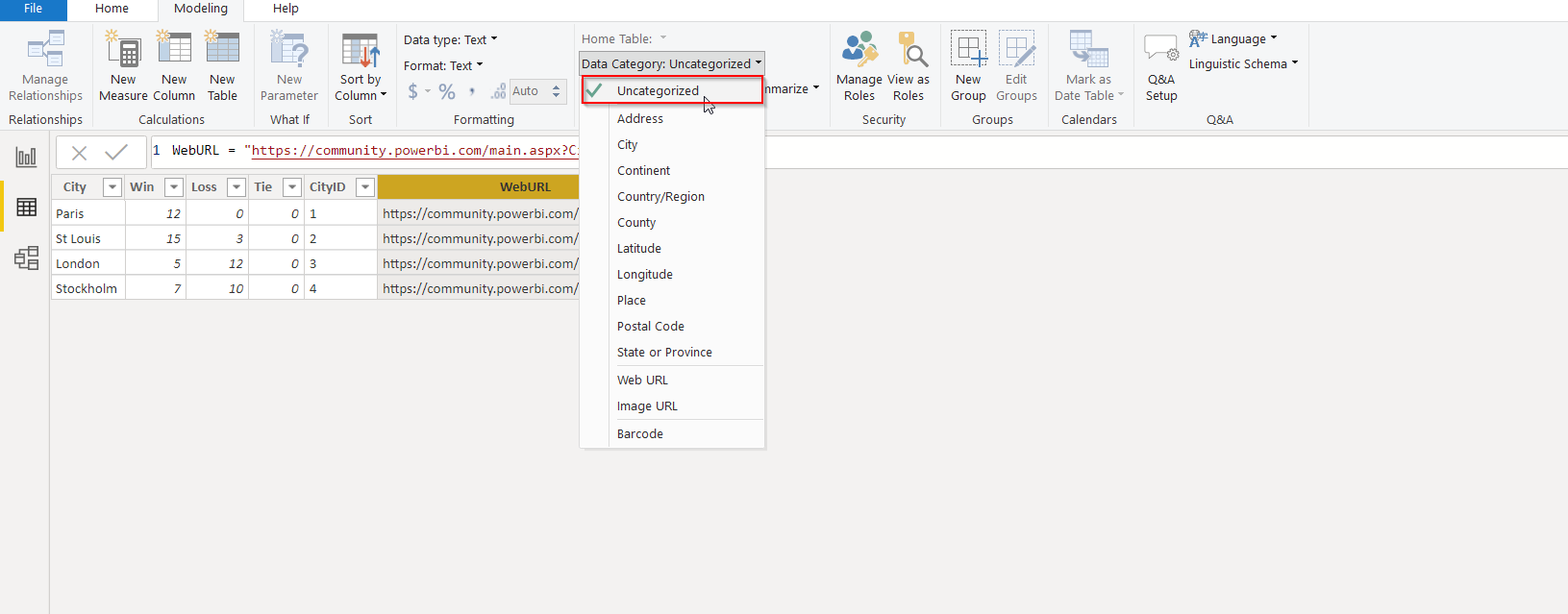 Step 3: In Data view, select the column and in the Modeling tab choose the dropdown for Data Category.
