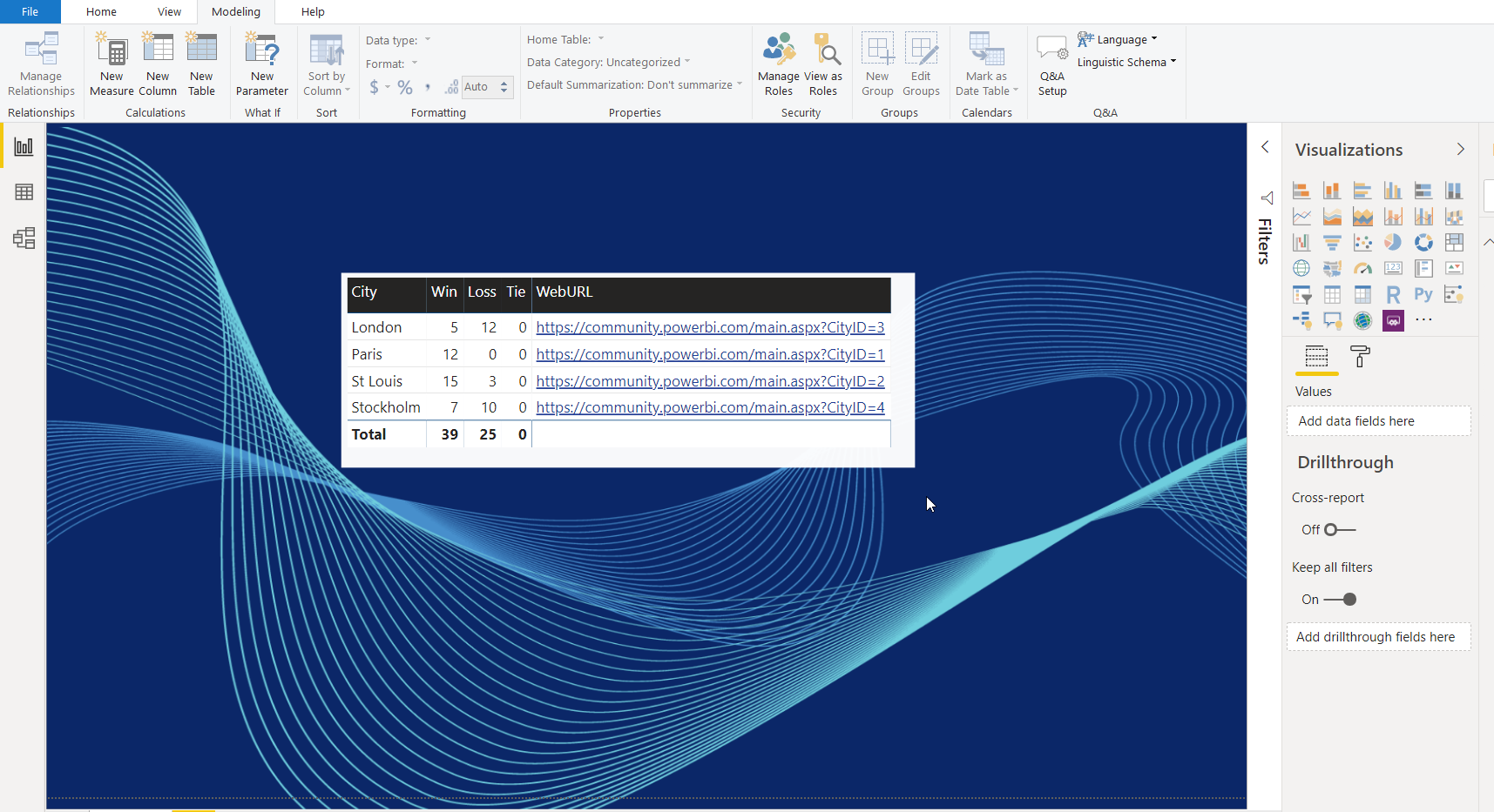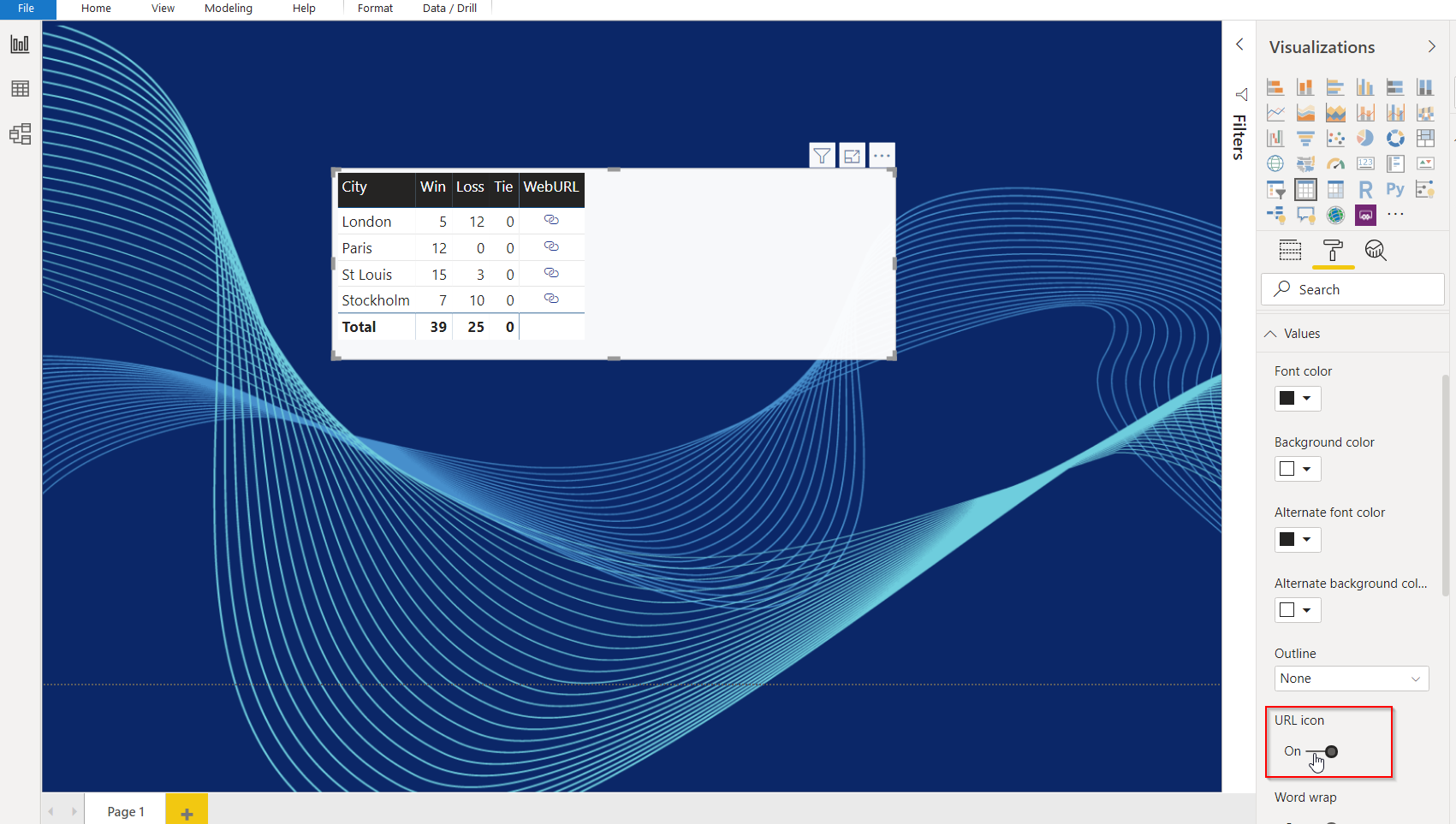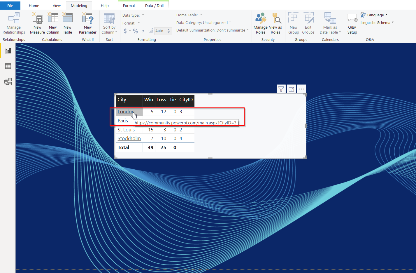 Step 5: Switch to Report view and create a table or matrix using the field categorized as a Web URL. The hyperlinks will be blue and underlined.