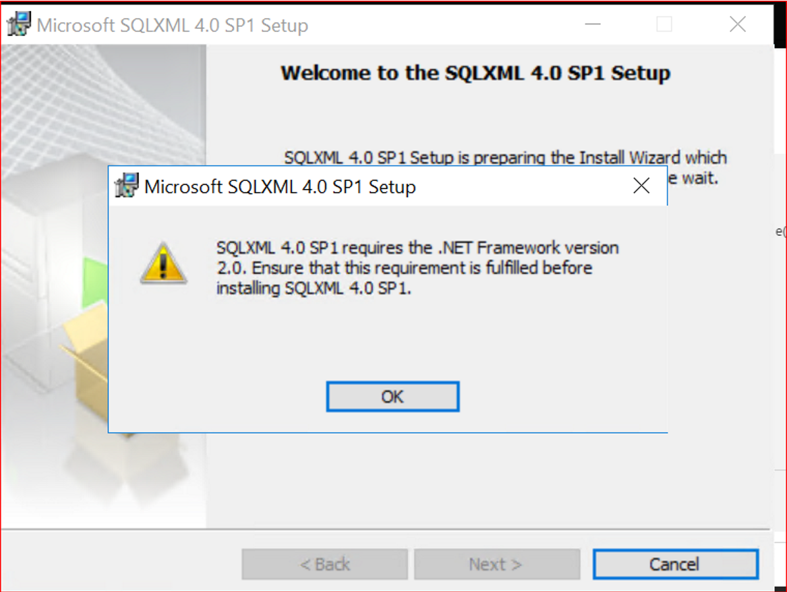 During installation, the first component is the SQL XML 4.0 SP1. It gets fails and comes back with error message as below.