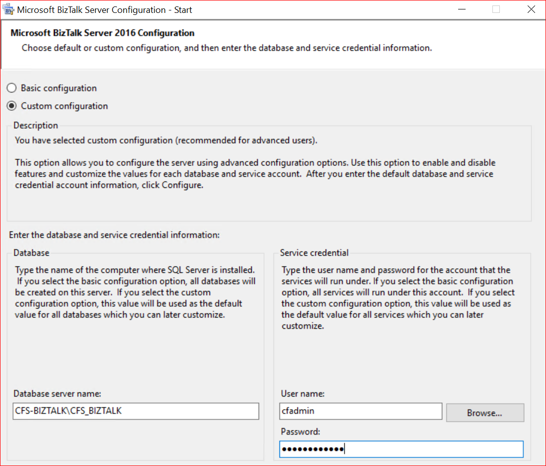 Select the Custom configuration and provide the user name and password. All BizTalk services will run under these credentials.