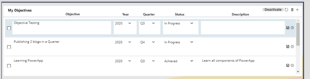 - There is a Screen on which there a Editable grid of custom Entity Objective.