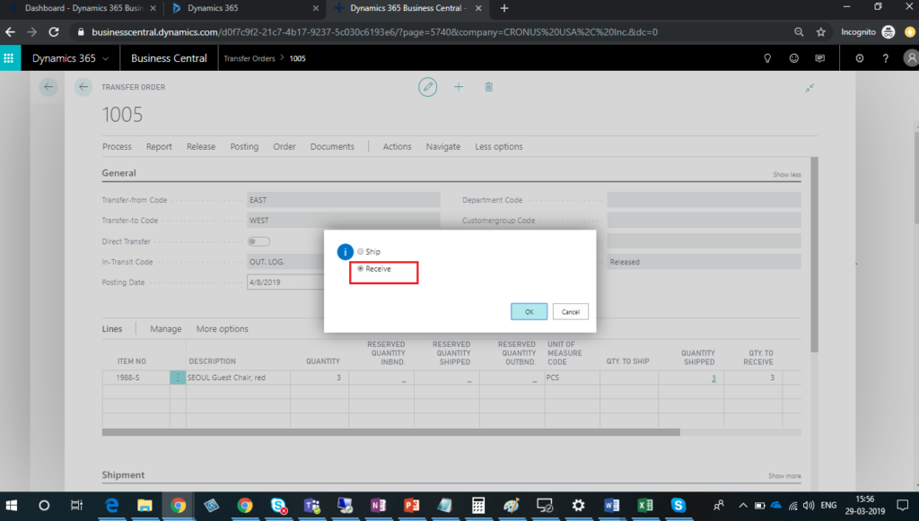 - Then again click on Post button to receive the inventory in another location. Select Receive in message box and click on OK.