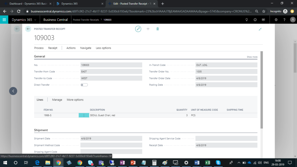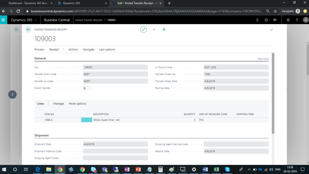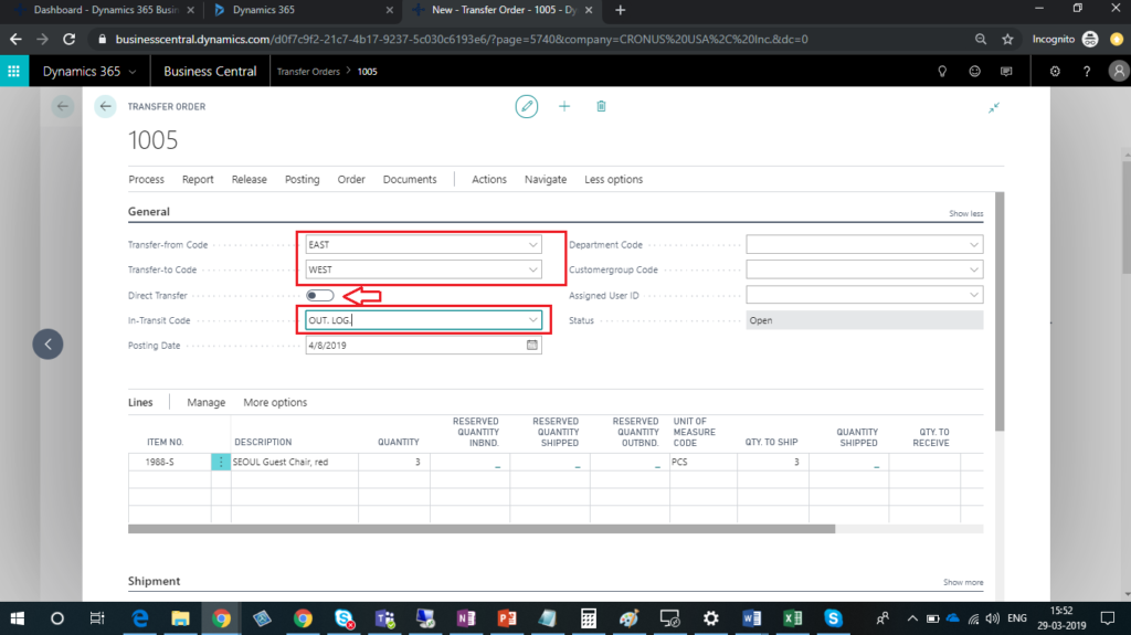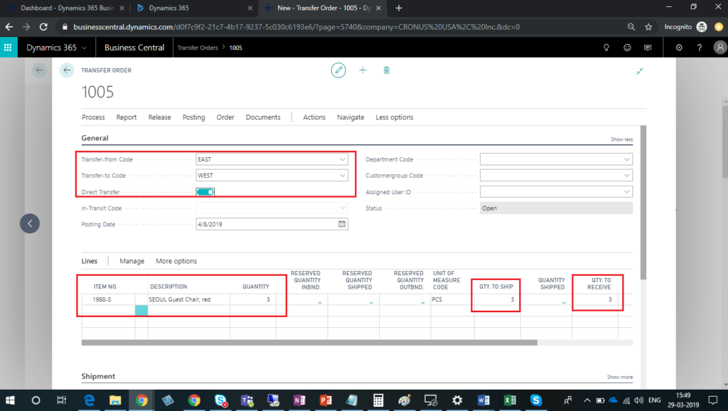 - Direct Transfer: If select yes then the transfer does not use as in-transit location. When you transfer directly, the Qty. to receive field will be locked with the same value as the quantity to ship.