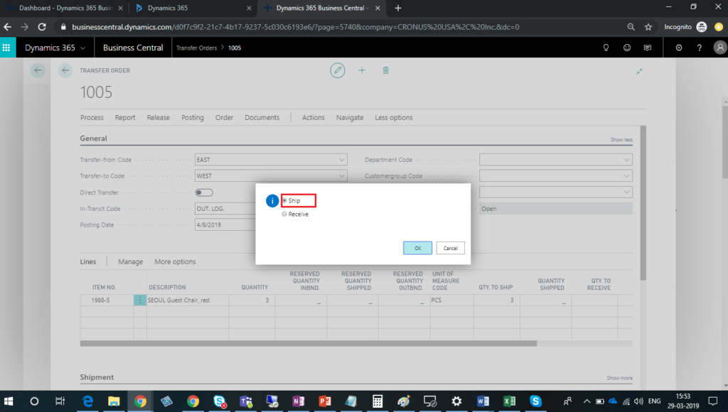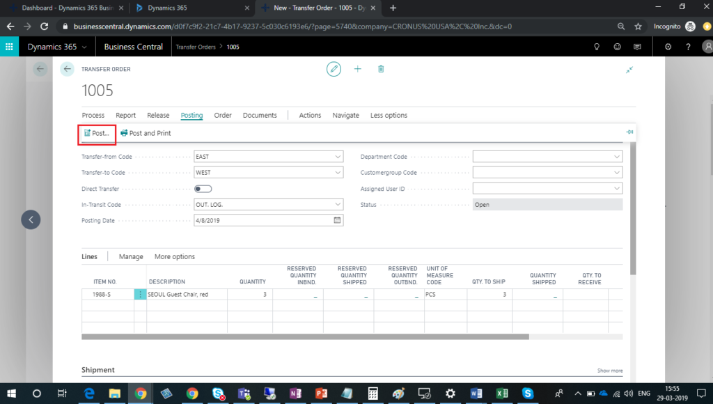 - On Action tab, click on post button to ship the Inventory from one location. Select ship in message Box and click on OK.